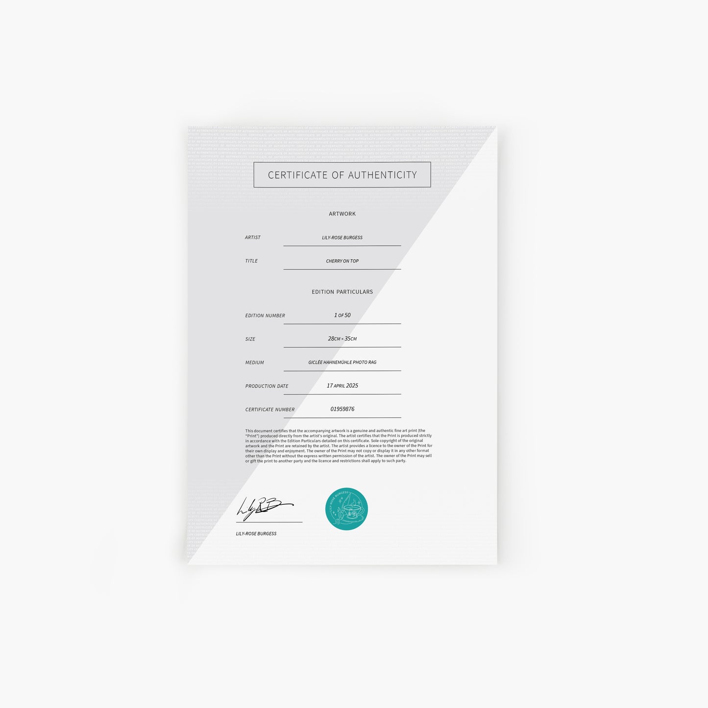 - Presented on acid-free, archival cotton PhotoRag Giclée paper from Hahnemuhle